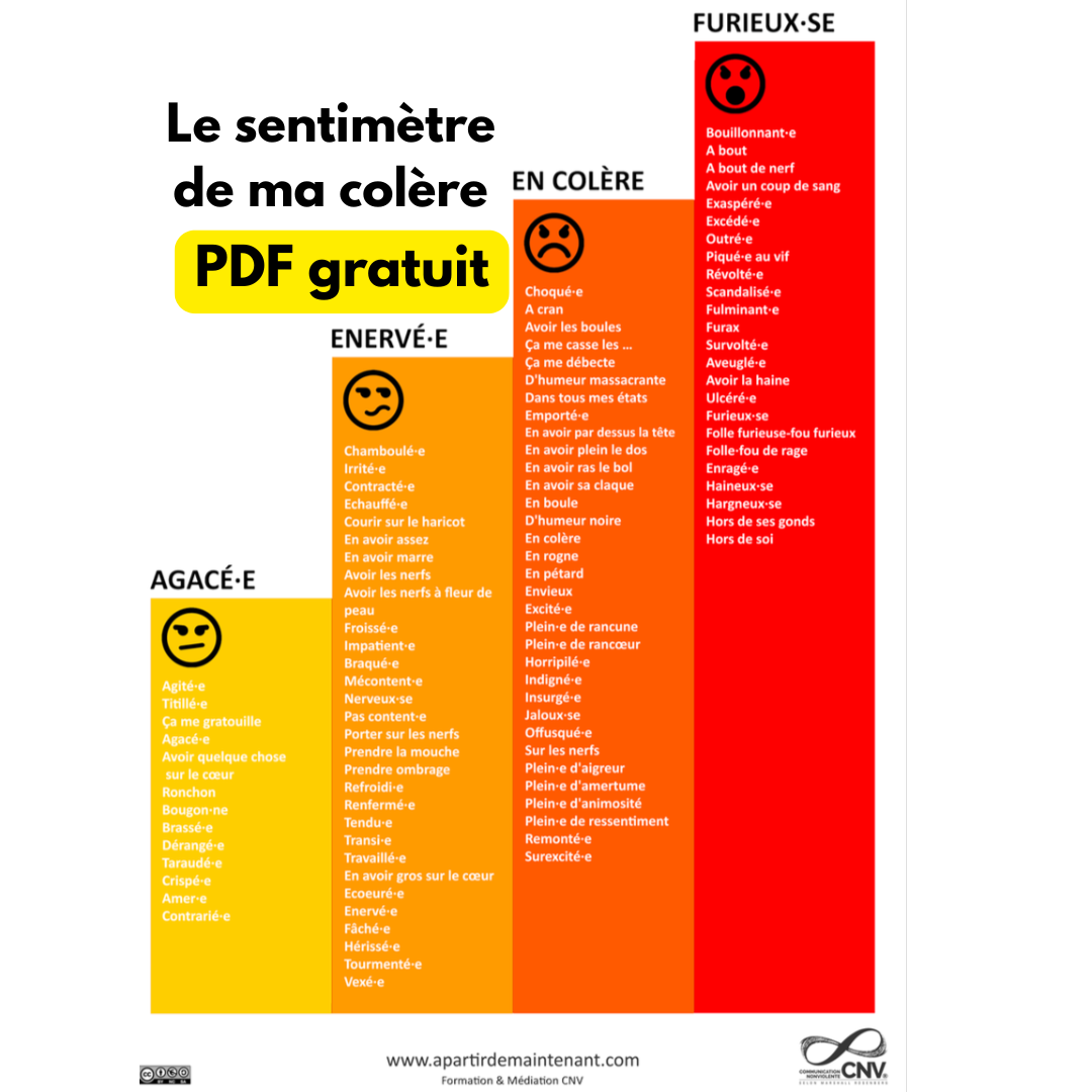 La colère est une émotion naturelle, saine et utile, mais souvent mal comprise. Trop souvent réduite à sa version explosive, elle se manifeste pourtant de nombreuses façons, avec des intensités très variables. Le Sentimètre de la colère, conçu par l’organisme « À partir de maintenant » (spécialisé en Communication NonViolente), permet de différencier les degrés de colère et de les nommer avec plus de précision.