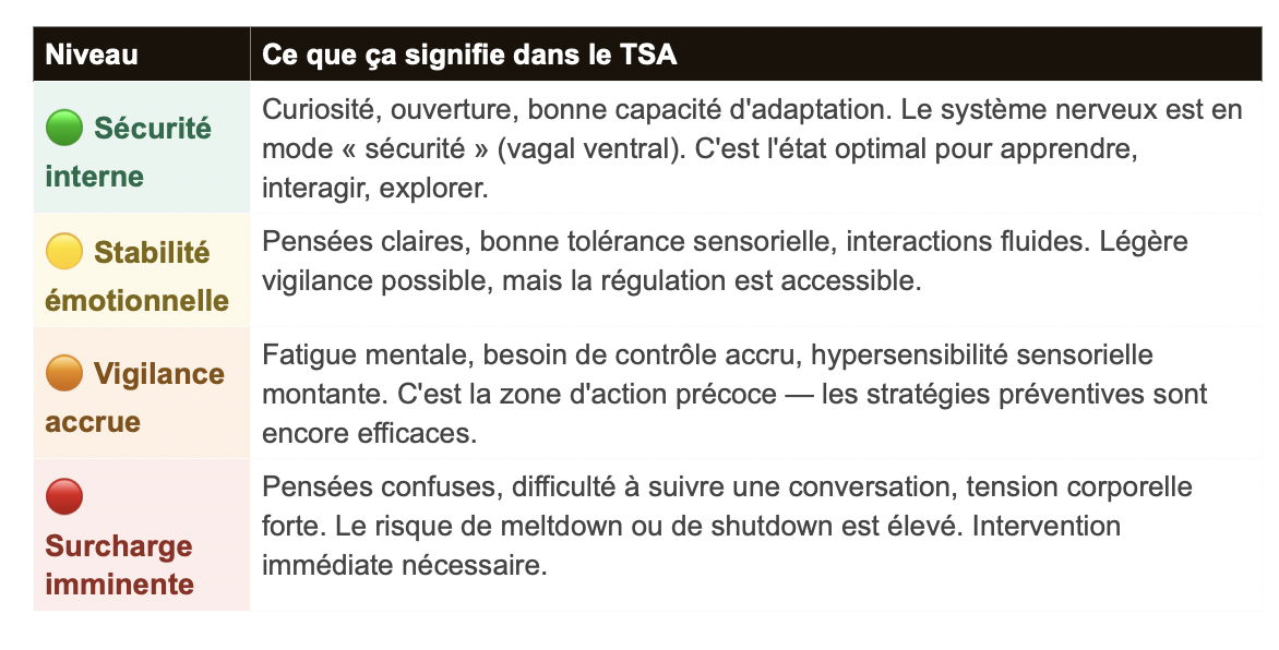 Concrètement : un enfant autiste qui commence à se boucher les oreilles ou à éviter les contacts visuels n’est pas en train d’être « difficile » — il monte dans l’échelle. C’est un signal à reconnaître, pas à corriger.
