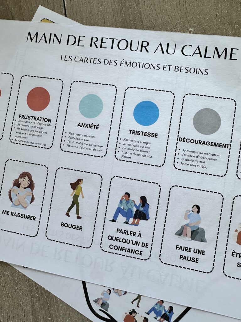 • 12 cartes illustrées représentant les émotions les plus fréquentes (colère, frustration, anxiété, tristesse, découragement, enthousiasme) et les besoins associés (me recentrer, me rassurer, bouger, parler à quelqu’un de confiance, faire une pause, être écouté·e sans être jugé·e).
